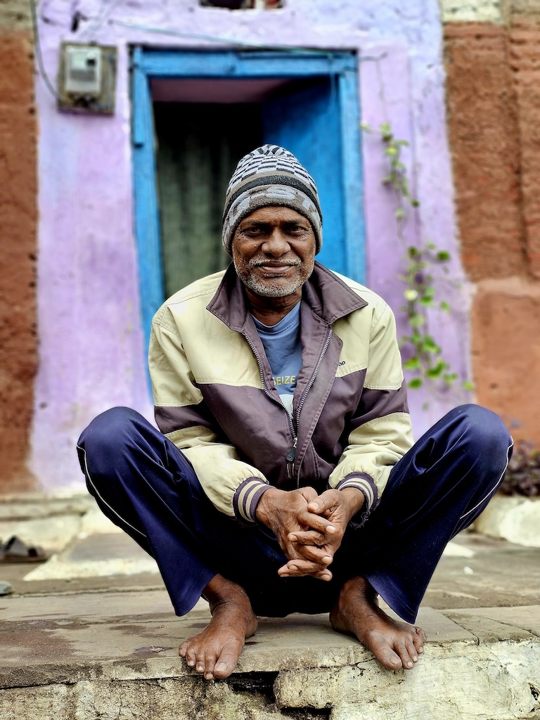 Dat detail blijkt een paleis te zijn, langzaam teruggenomen door vocht en begroeiing. Een indrukwekkend gebouw waarvan de oprit is verworden tot een organisch stort en tegelijk de toegang vormt tot de uiterst eenvoudige woning van een man die gehurkt voor zijn huis zit en het leven gadeslaat. Hij glimlacht, nodigt me uit om te gaan zitten en zwijgt. We delen geen taal, maar verstaan elkaar — in stilte, via blikken. Zoals zo vaak in India blijven nieuwsgierigen niet uit. Ze willen weten waar ik vandaan kom, wat ik hier doe, of ik getrouwd ben, kinderen heb, al gegeten heb…
